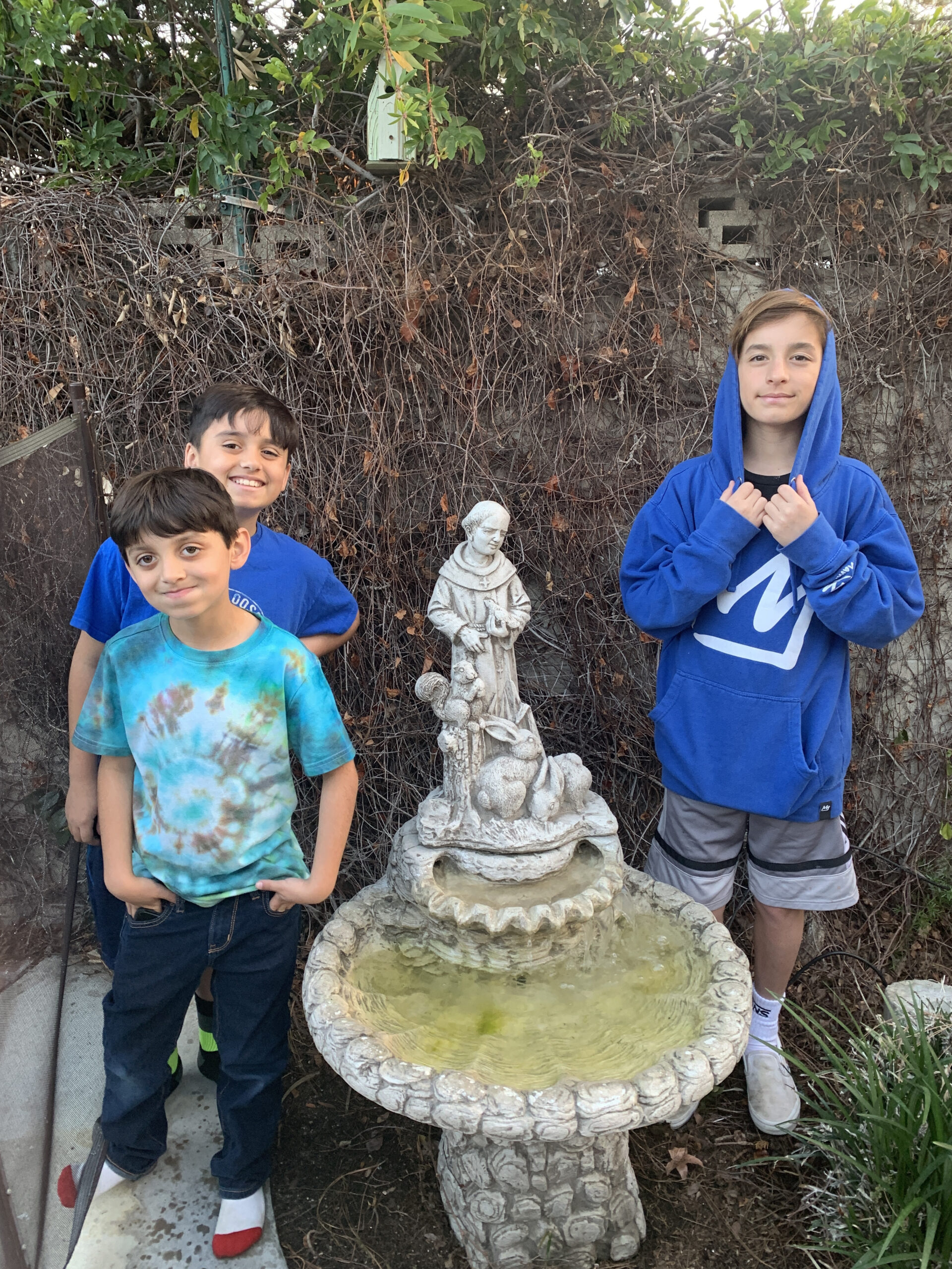 We had already put off the house painting but we were hesitant to invite the family over for a barbecue because of the nesting hummingbird. The two chicks hatched on May 20th, so we warned the boys to stay clear of the nest. Instead the boys found a lizard to occupy their time. Before torturing the poor thing, they baptized it in the St. Francis fountain. They also lathered it with sunscreen so that the creature could breathe better. I watched as they performed the baptism and thought that I could rescue the lizard, but by that time their actions were irreversible. Even though they freed the little guy, I doubt that it survived their impish hands. The boys swam, and, thank God, they never disturbed the nest.