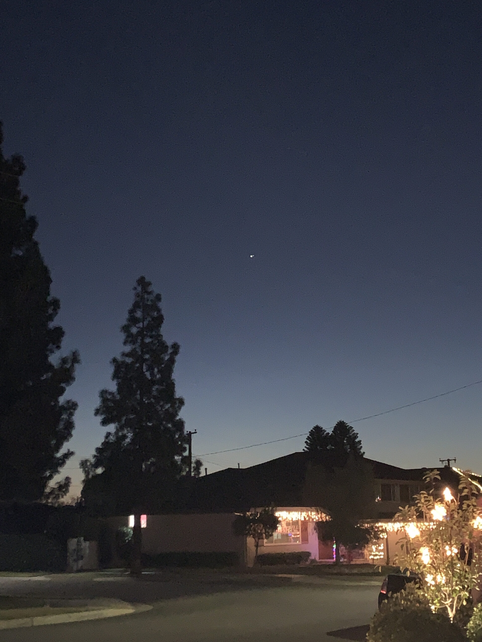 On December 21st, I patiently waited for the sun to set. Witnessing this wondrous miracle from God caused much-needed excitement. The last time Jupiter aligned with Saturn was over 800 years ago. I joined several of our neighbors as our eyes scanned the southwest of the clear California skies. At first nothing appeared to be out of the ordinary, so we all went back to our homes. About 45 minutes later I stepped out and could not believe the breath taking sight. Our neighbor Kyle was star gazing as well. I was running around like Chicken Little; I wanted to announce this fascinating event to the whole world. I called out to all the neighbors in our cul-de-sac and, with great excitement pointed to the Star of Bethlehem. This title is fitting because the Three Kings witnessed the heavens open to reveal its special blessing to give us hope. I called my granddaughter Maddie and Sonja, my daughter. I called Helen and Sarah and ran to Lalo, our neighbor, and made his family come out to witness this once-in-a-lifetime occurrence.