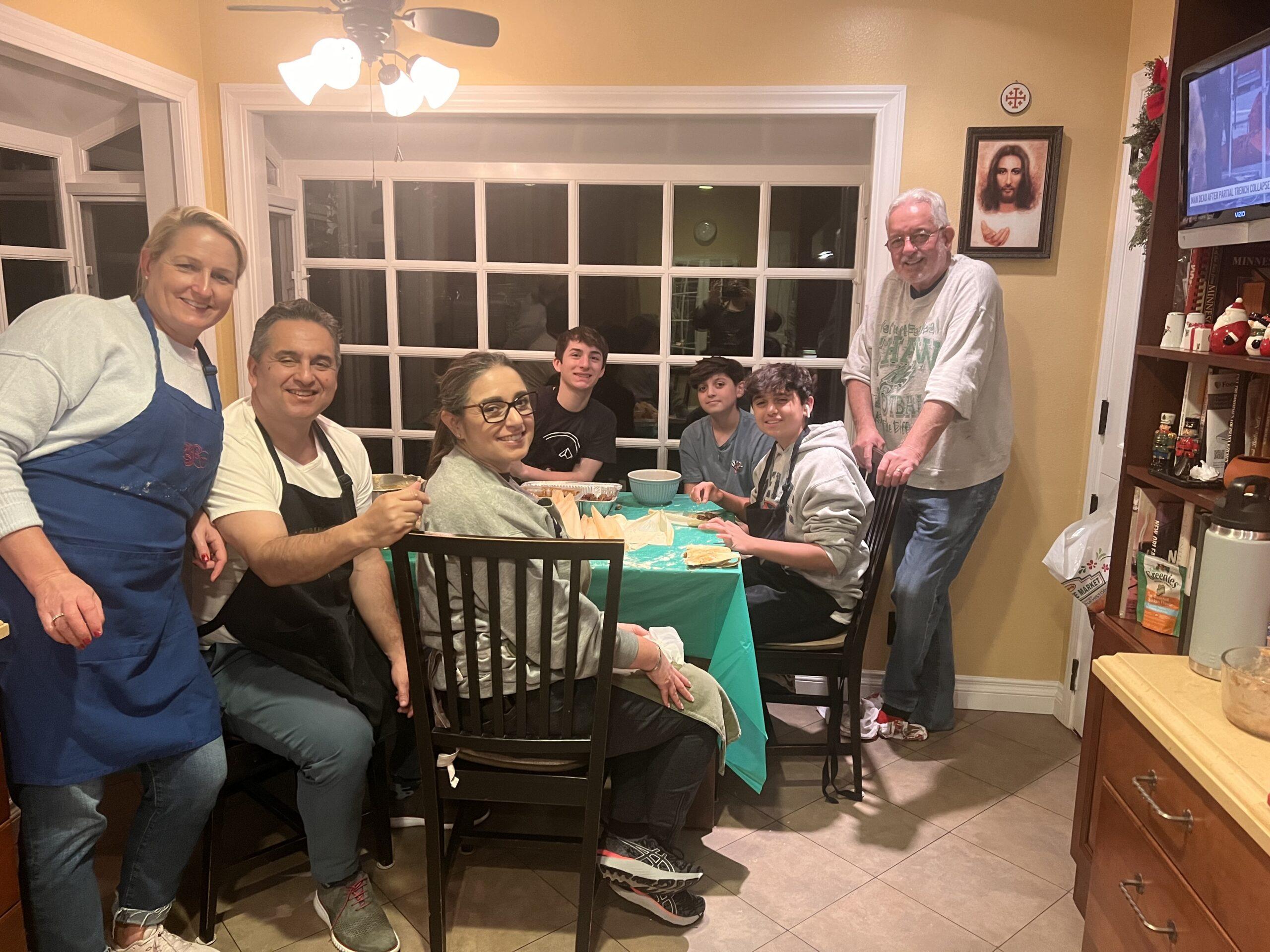 No one was in the tamale spirit this year. I give tamales as gifts to friends and neighbors so, of course, I have to rally the family into making them. It was just us, minus our granddaughter Maddie who was at work. I had staged the kitchen for this messy production. Something always goes amiss with this assembly; this time the sauce was too runny! Sonja came up with the idea of adding corn starch, but I felt that adding this ingredient would compromise the flavor. No one ever listens to me!