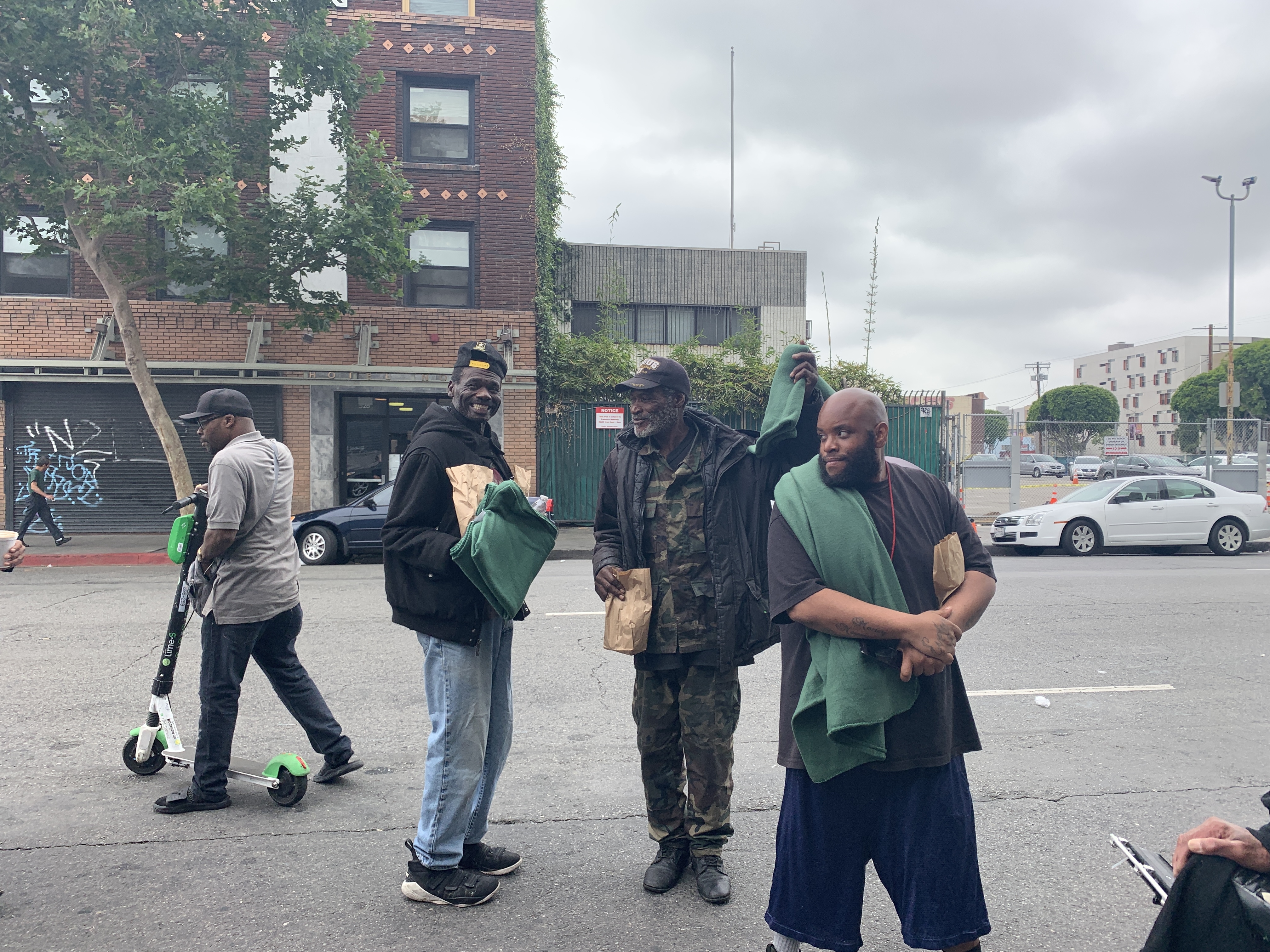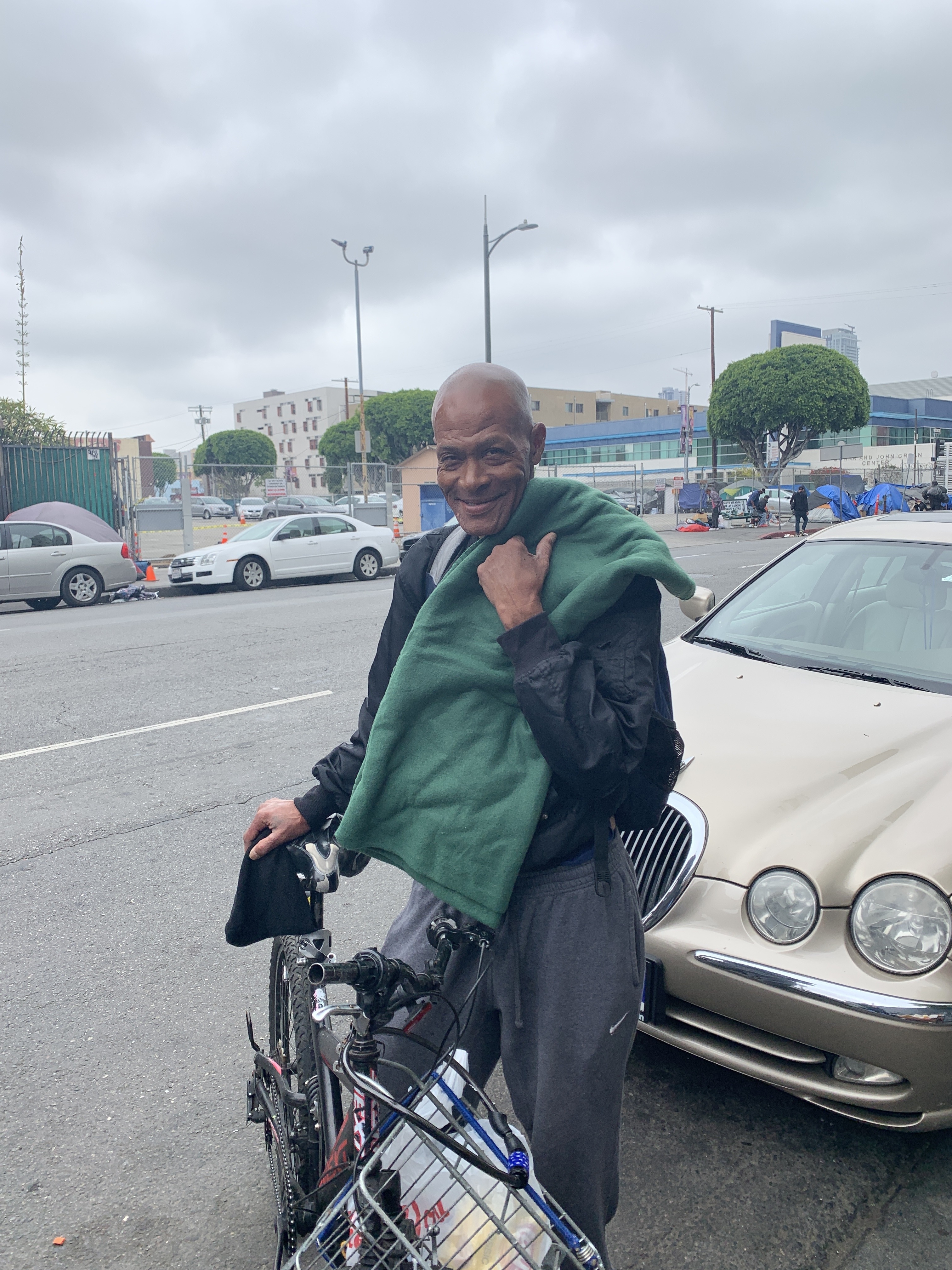 Robert was late in meeting us, so I recruited Malcom, a citizen of Skid Row, to watch over us. Malcom was obliged to help. This precious man stayed with us for a while. He followed us on his bicycle and watched as we handed out the meals. By the time we ran out of sandwiches, we had to go back to refill our wagon. We remembered that Michael and Trisha had donated about 20 green blankets. These blankets were handed out in a flash, but I made sure Malcom received one.