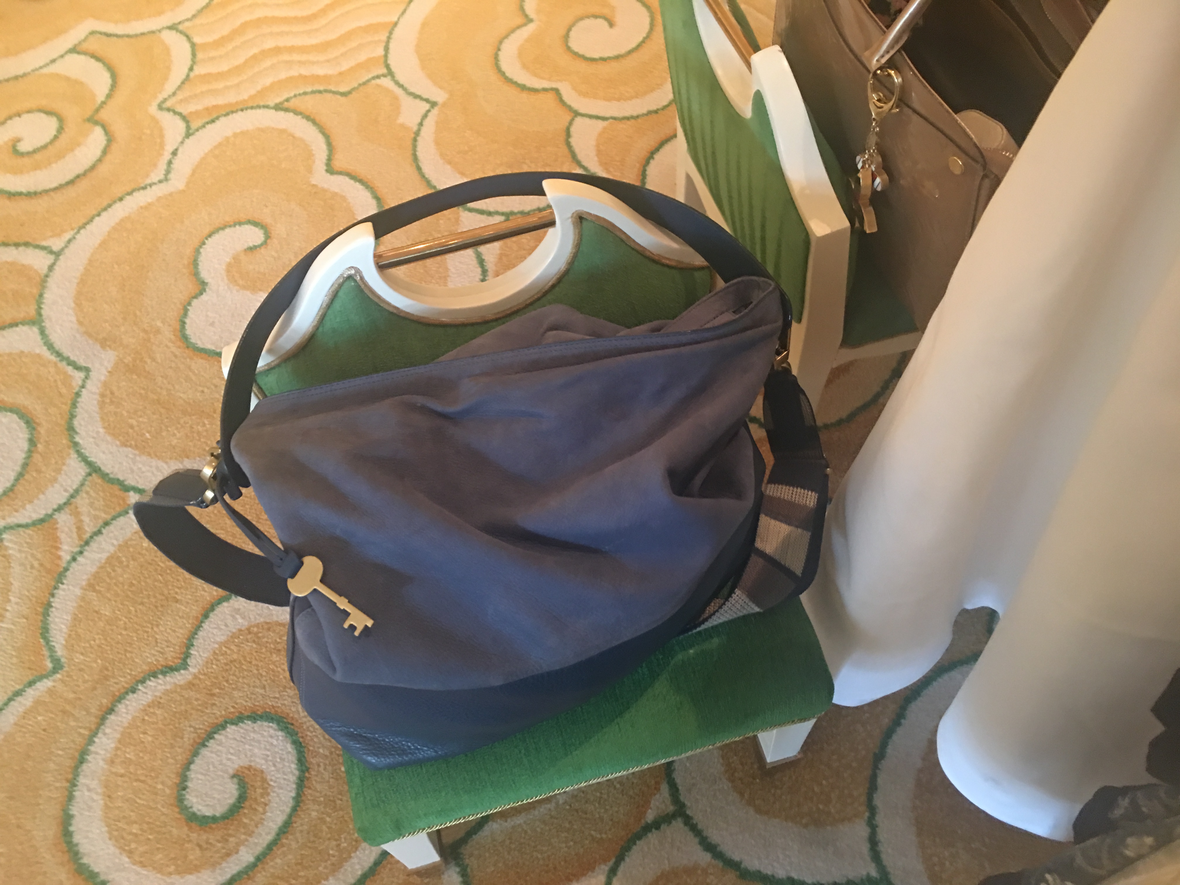 Dinner was at a five star restaurant at the hotel. The restaurant is a beautiful establishment featuring Chinese food and ornate gold decorations. My eyes feasted on the wall decor and the opulent gold design splashed everywhere. Then our menus arrived and Helen and I got these miniature chairs for our handbags.
