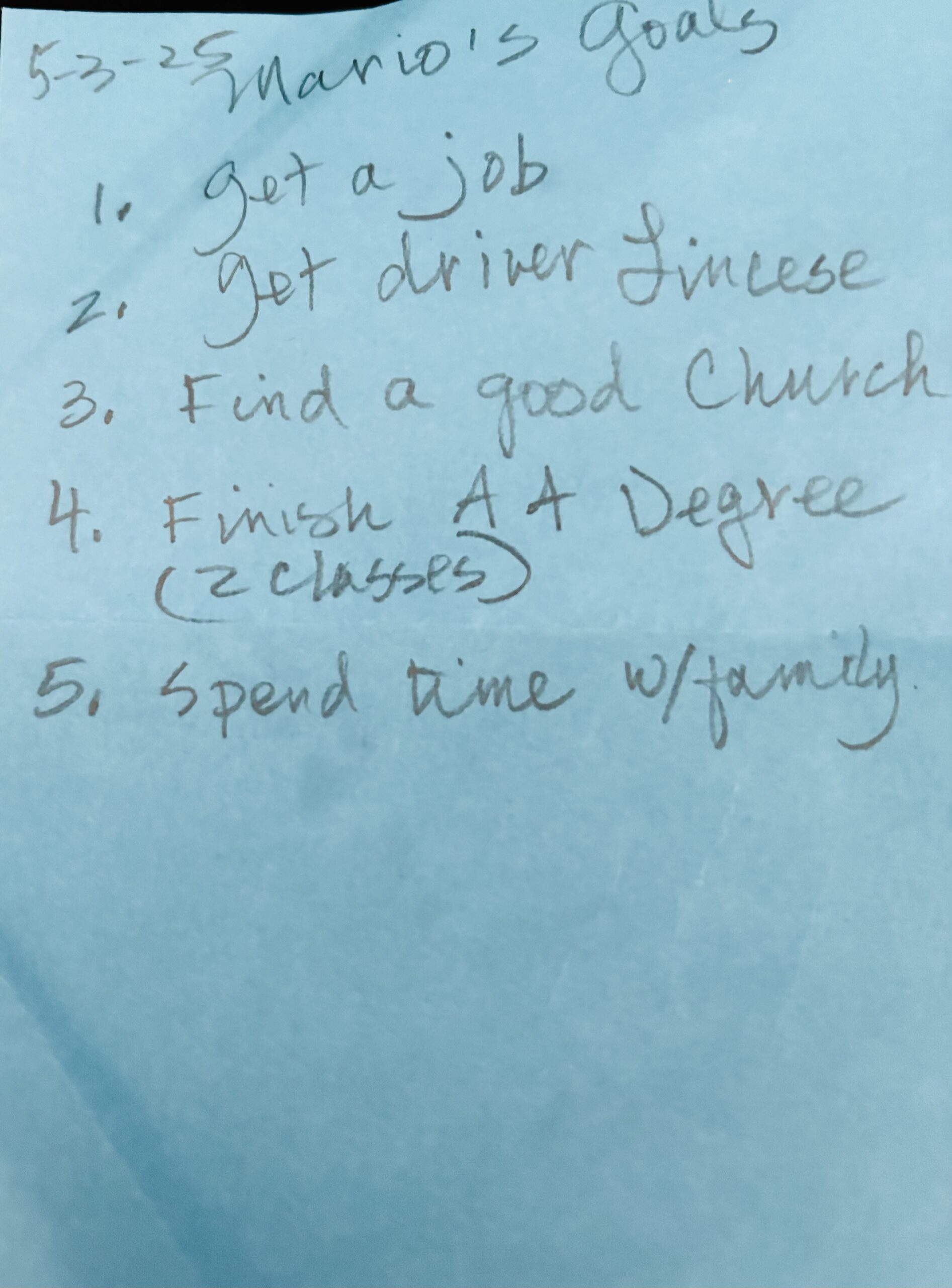 The first thing Mario wants to do is get a job. The second thing on his list is to get his driver’s license. This falls second because he needs to complete DUI classes to get this in order. This matter has been hanging over him for years. He wants to find a good church. Mario wants to complete his AA degree; he lacks only two classes. And he wants to spend time with his family. I am asking, if you read my Blog, please add Mario to your prayers. Pray that God will grant him the desires of his heart.