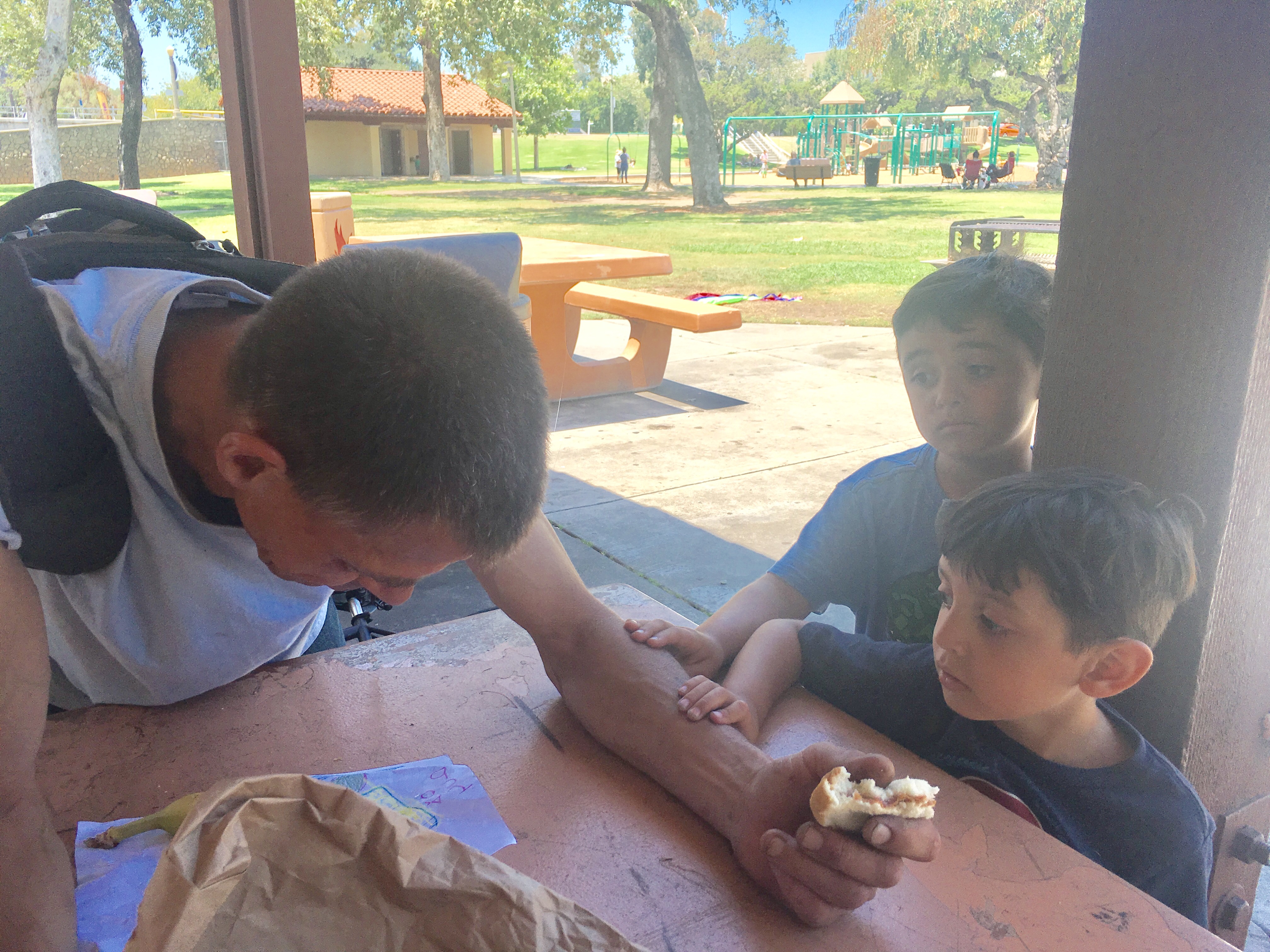 I told the boys that they had to do something kind for using bad words. We made sandwiches for a picnic and packed two extra lunches for the homeless. The boy drew pictures and we placed them in the lunch bags, then we headed to Hart Park. Lucas and Jacob handed out the two lunches. One man, Victor, was so touched with the kind act that he asked the boys to pray for him because he was an addict. Lucas asked me, “Grandma, why was Victor crying?” I told him that he was overcome with joy because we made him a lunch and showed him love.