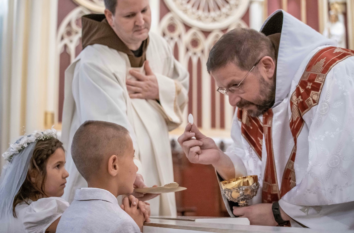 Father Leonard dispensing First Holy Communion, Bro. Leo assisting