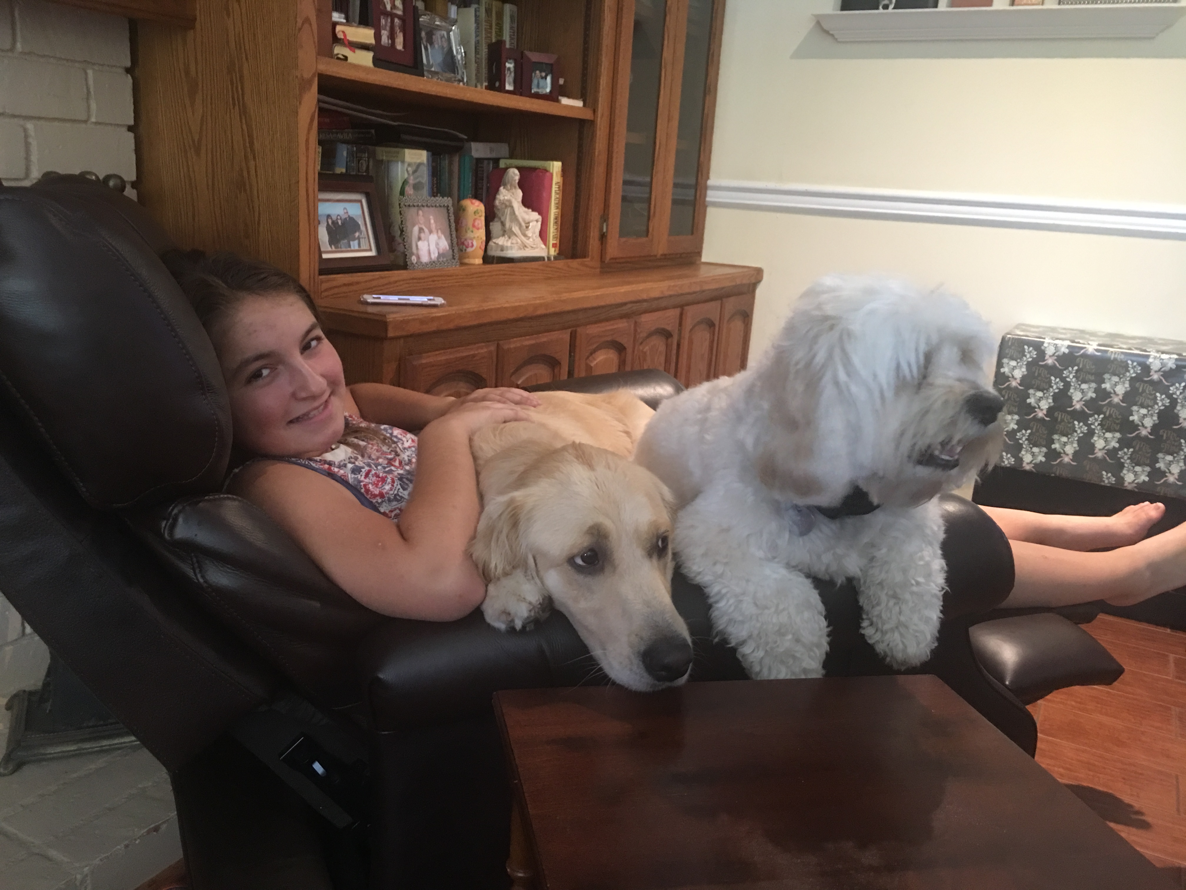 Mike and I decided to be dog free because we travel and did not want to be burdened with dog care. We now have two grand dogs that visit every time their families come. Paco spends his time barking at airplanes, lizards and anything that makes the slightest sound. Rosie, is a sweet mild mannered golden that thinks she is a small lap dog. Unlike her ancestors, she hates the pool.