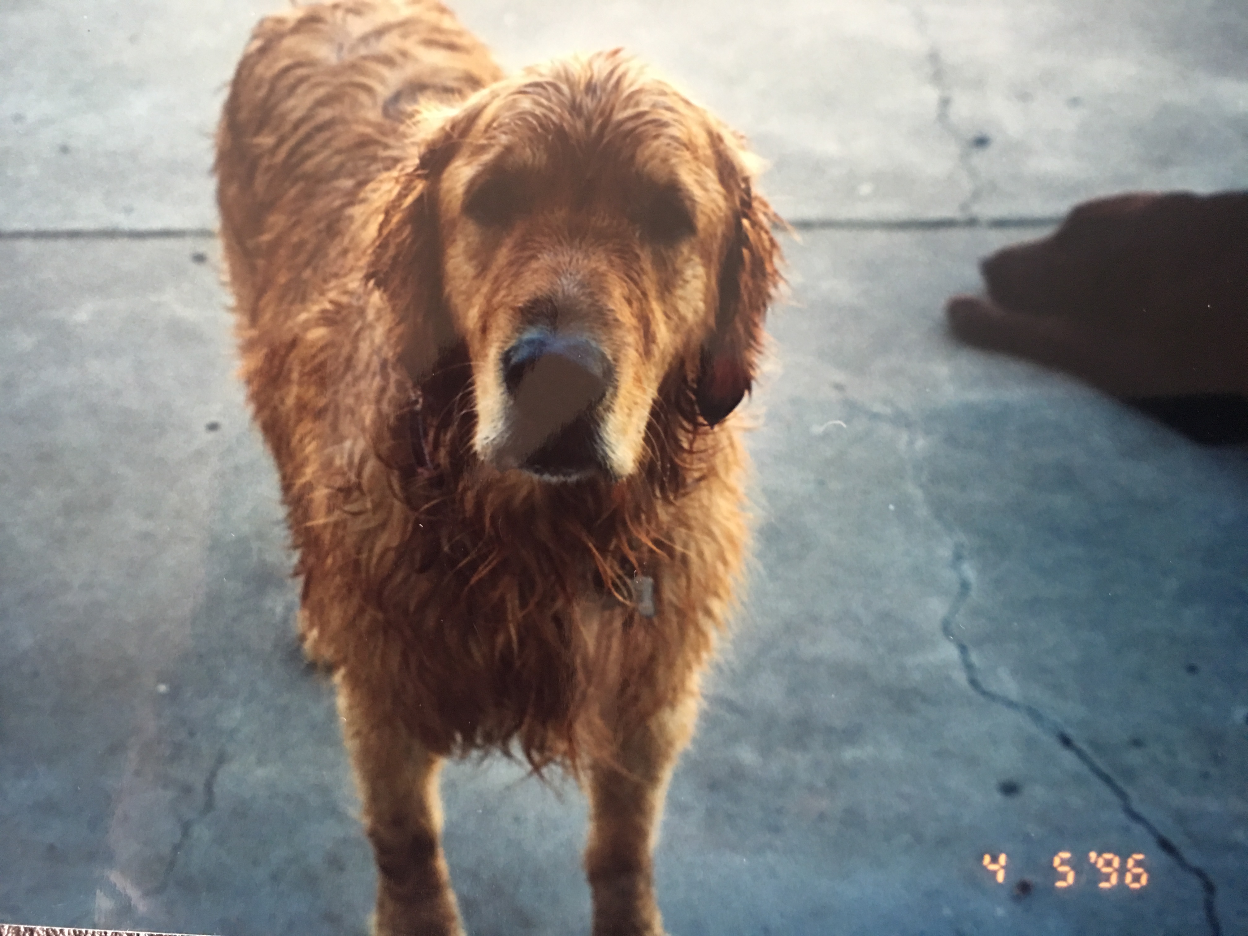 Big Mel was given to us by a neighbor and was a huge golden that suffered from narcissism. He intentionally knocked over small children, and had been through three families. We were his last chance because he was going to be put down due to his bad behavior. We took him in, Big Mel was a Houdini and would always escape on trash day to knock over the neighbor’s trash bins. We could not handle him either, and shipped him to Santa Barbara with Mikos. They were inseparable, Mel finally experienced true love. While Mikos attended classes, Big Mel entertained himself at the beach, and everyone in the community knew him, including the police. Mikos remembers when a police car drove up with Big Mel in the back seat; the officer opened the door and Big Mel jumped out . Big Mel used his nose to let himself into the house. We were all there the day he went to dog heaven. My son took Big Mel’s collar and buried it at Ledbetter Beach in Santa Barbara.