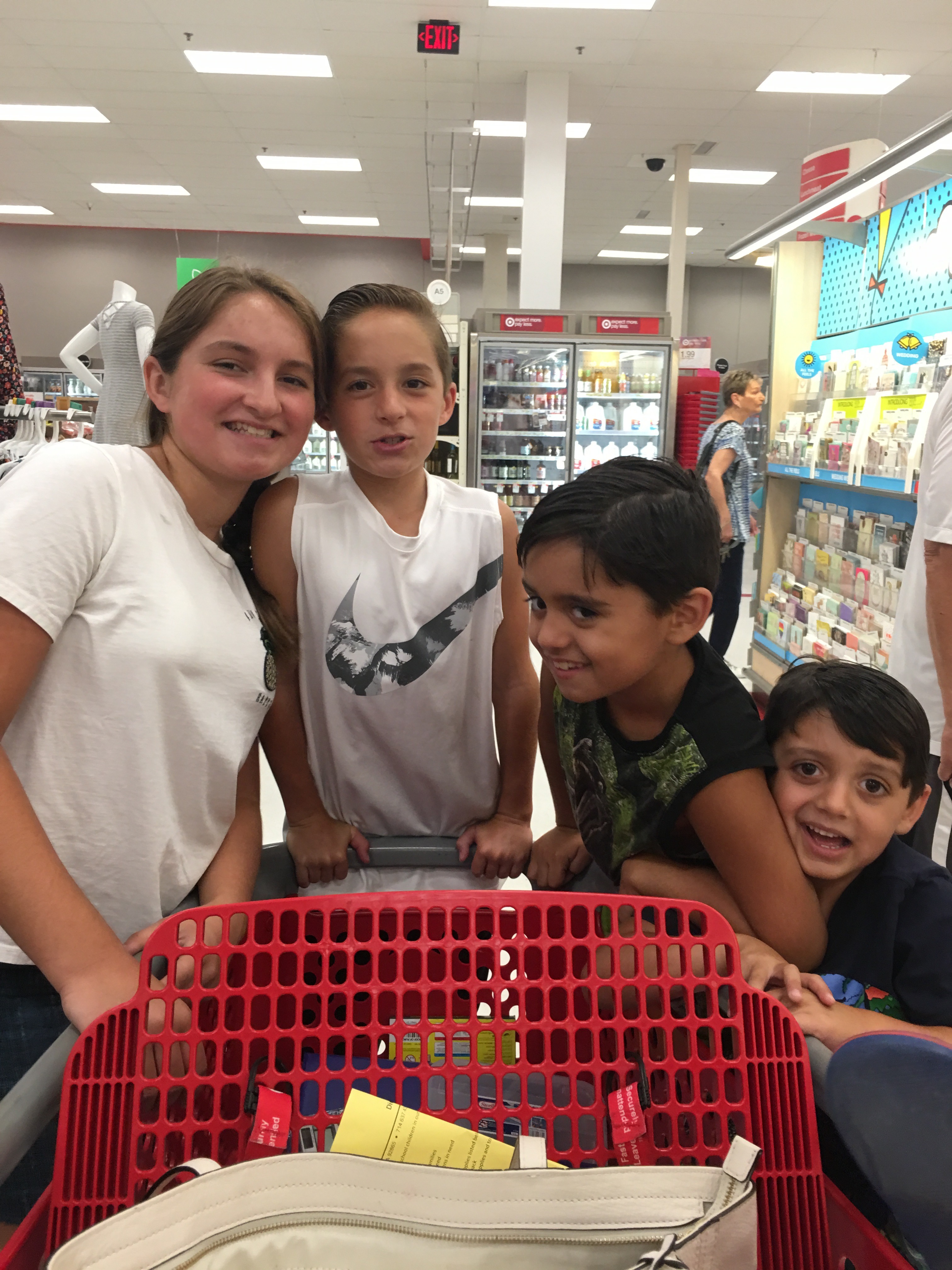 Hours passed and we had a project to complete. St. Norbert Parish’s, filling backpacks was under way. I picked up two backpacks for us to fill. Maddie spearheaded the project by checking and comparing prices for school supplies, and found that Target had the best prices. We loaded up the SUV while Maddie separated the items to be purchased into two groups. Will and Lucas were team one and Maddie and Jacob team two. It did not take long before Will and Lucas started acting up and running around like wild boars. After a few threats, they sorta of calmed down. A woman and her daughter looked at us like we had the plague, Maddie overheard them say, “Here they come, let’s go another direction.” I so much wanted to explain that these kids were not my children, but they disappeared from my view.