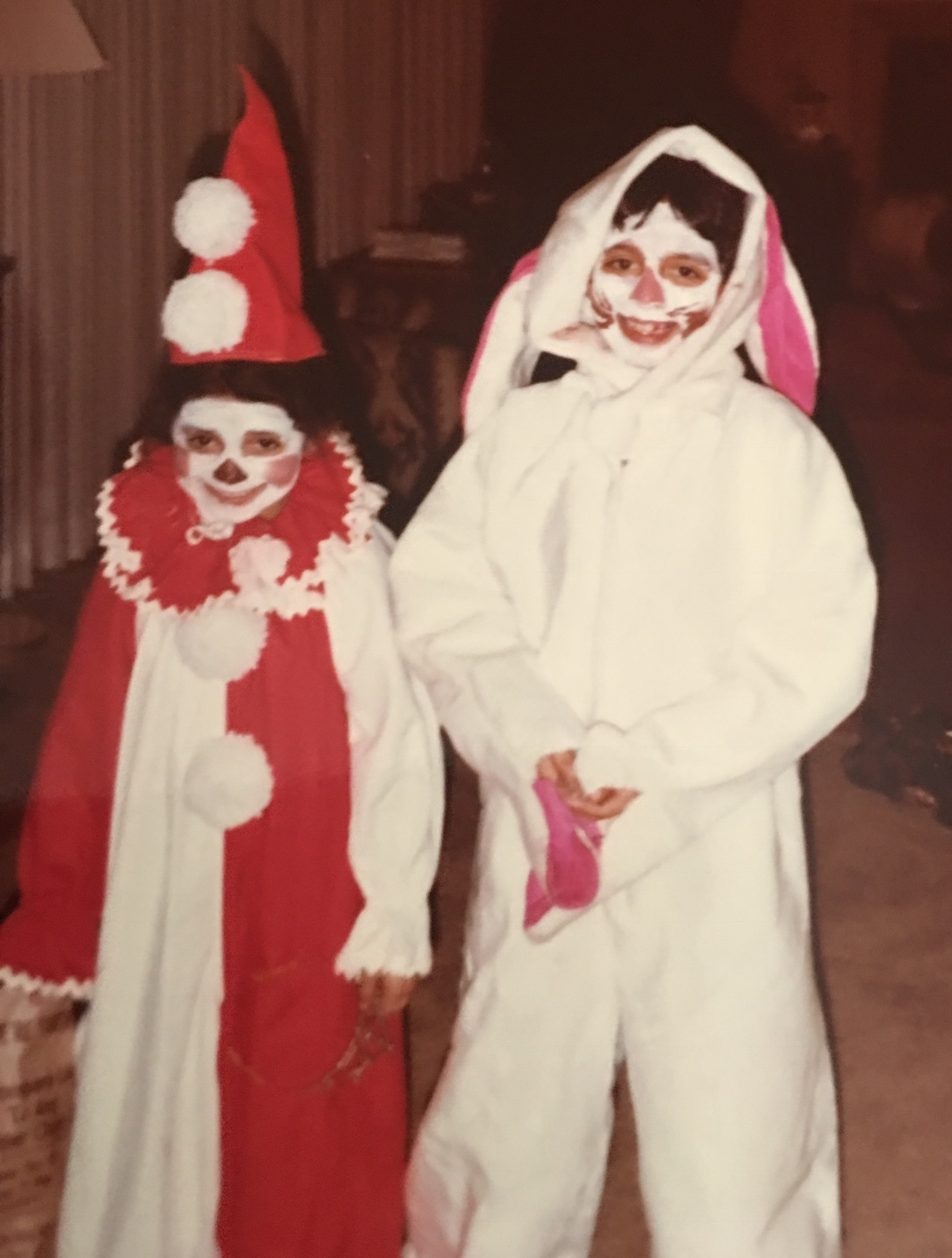 Poor Mikos! Not only did he wear the bunny costume but I painted his face all weird. This was a church party, and when Mikos walked in he saw his little friends in real costumes. One was a baseball player, the other one was a pirate, but Mikos was the white-faced Easter Bunny!